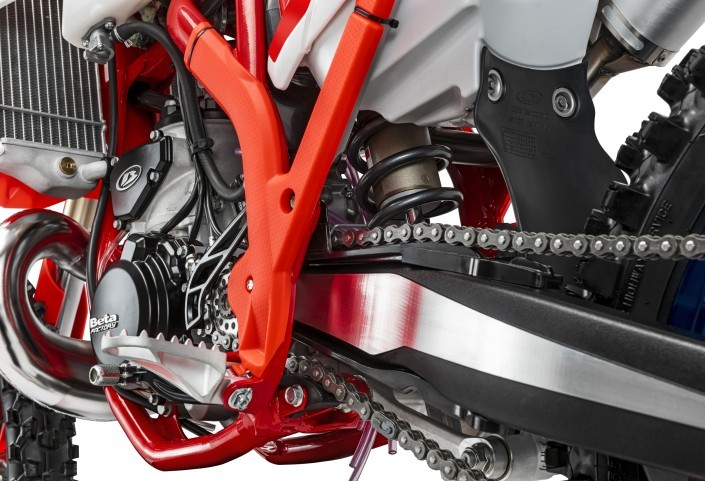 - Zylinder, Kolben und Auslassventil: Um diese so unterschiedlichen Eigenschaften zu erreichen, bemühten sich die Techniker von Betamotor zusätzlich zum offensichtlichen Hubraumunterschied um neue Zylinder und Kolben, die speziell für die unterschiedlichen Hubräume entwickelt wurden. Auch das Auslassventil, das zwei sehr unterschiedliche Leistungsspektren bewältigen muss, wurde durch den Einsatz unterschiedlicher Federn für die beiden Modelle speziell kalibriert.