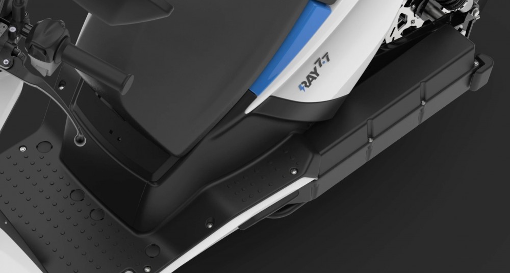 Der zentrale Hochtemperatur-Permanentmagnet-Synchronmotor liefert eine Dauerleistung von 11 kW (14 PS) und eine Spitzenleistung von 17,5 kW (23 PS). Mit 60 Nm Motordrehmoment und 290 Nm am Rad beschleunigt die RAY 7.7 deutlich kräftiger, als man es von einem typischen 125-Kubik-Pendant erwartet – zugelassen ist sie in der L3e-Klasse, bietet aber fahrdynamisch eher Eindrücke eines 300-Kubik-Motorrads.
